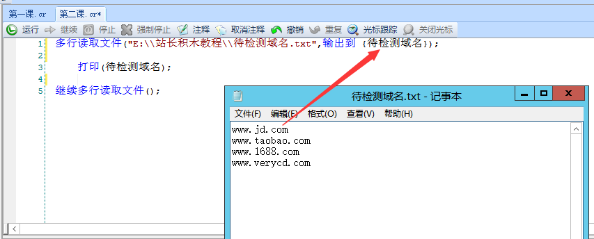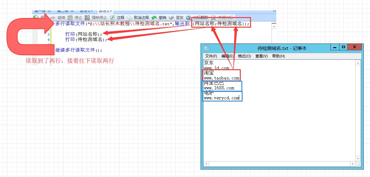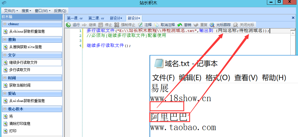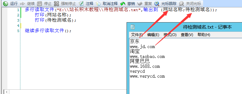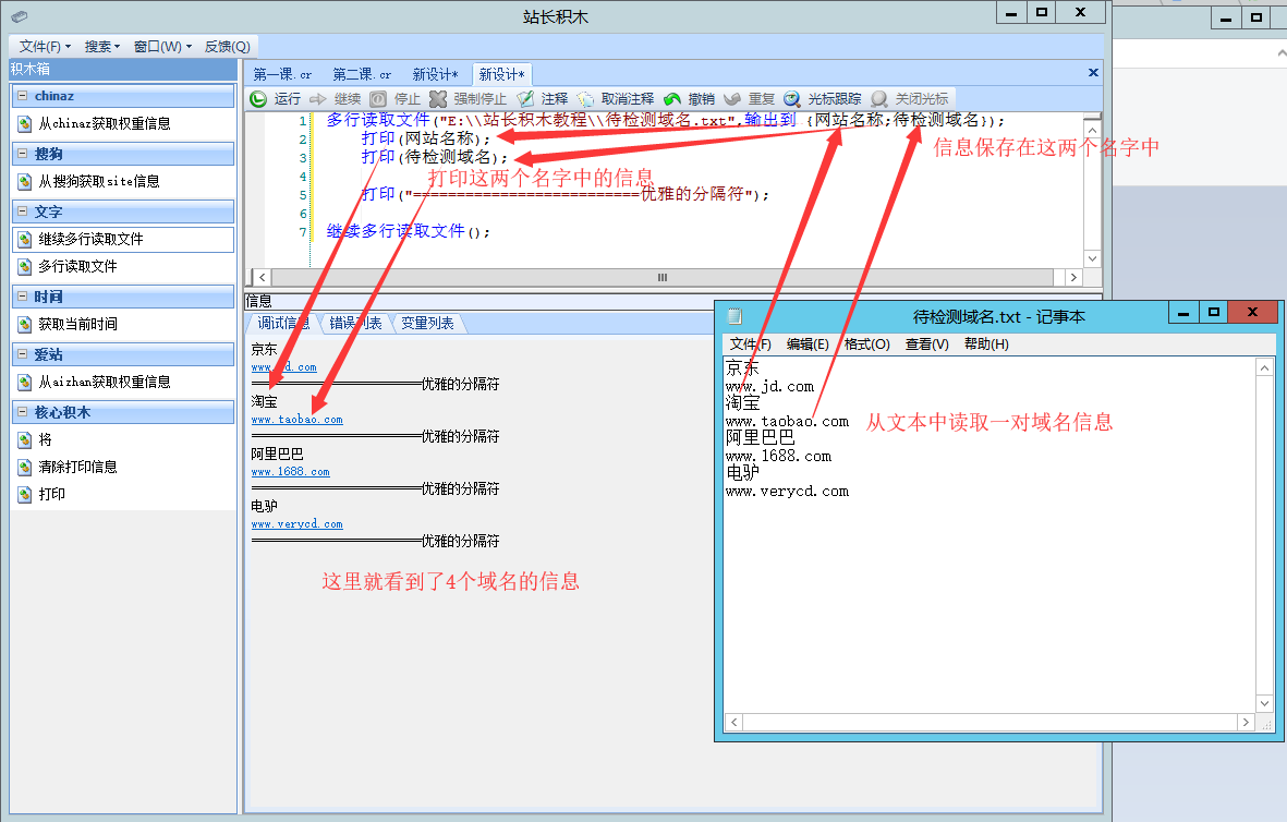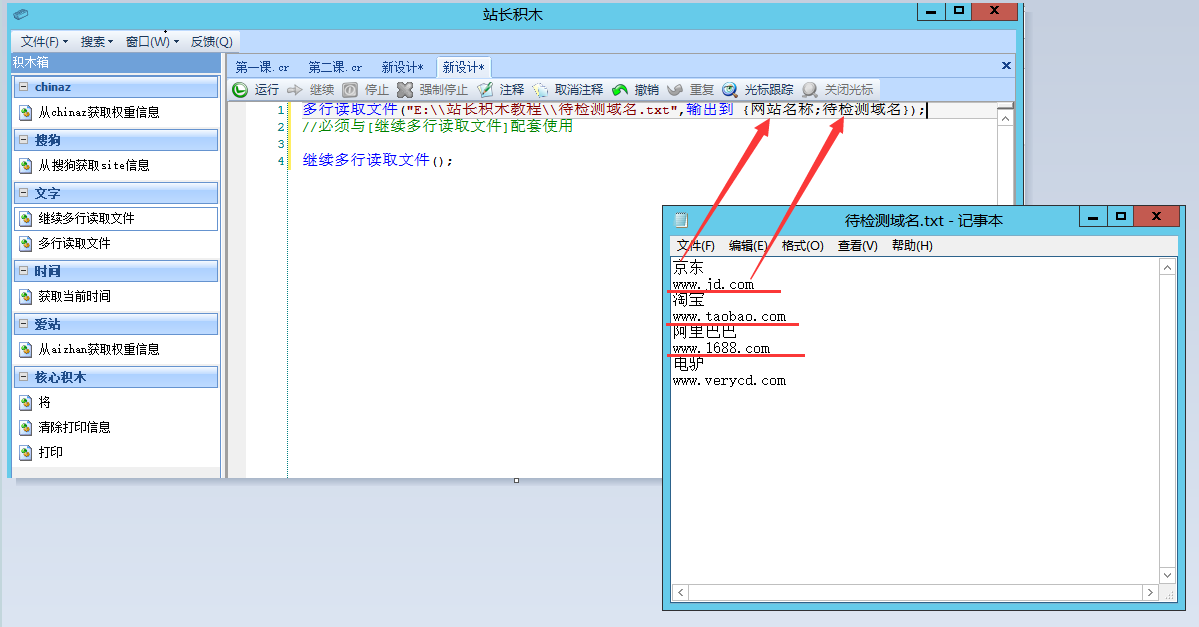 我们以文本文件在目录"E:\\站长积木教程\\待检测域名.txt"为例,我们看到例子中的待检测域名有4个,京东、淘宝、阿里巴巴、电驴,我们需要告诉站长积木,文本中的内容怎么输出并保存起来。左图1: