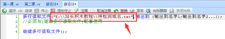 多行读取文件("E:\\站长积木教程\\待检测域名.txt",输出到 {待检测域名});
