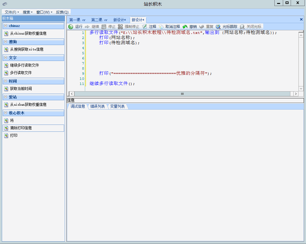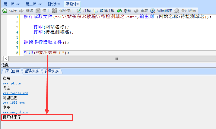 多行读取文件("E:\\站长积木教程\\待检测域名.txt",输出到 {网站名称;待检测域名});