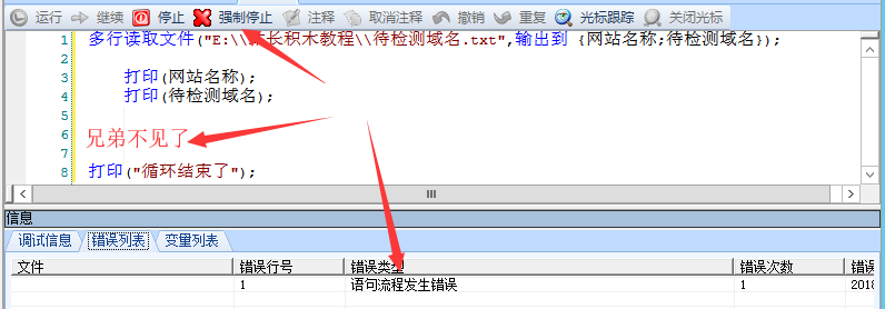 重要的事情再次说三遍,你也可以试试将这两个兄弟分开,那么站长积木一定会报错,这个时候你就只能用强制停止来结束了,左图3: