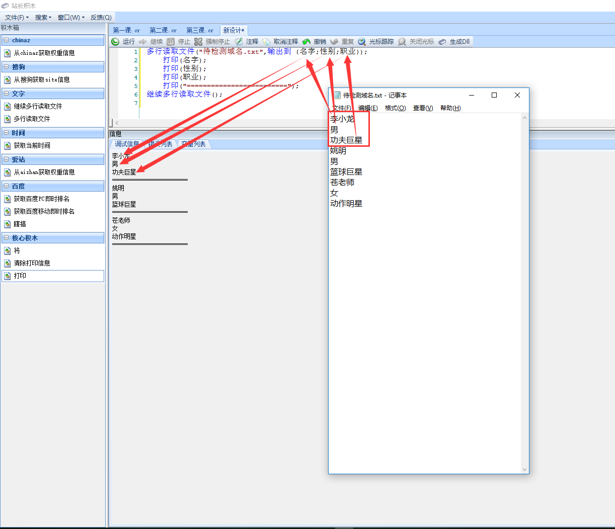 当我们需要读更多行时,如何处理呢,在积木文件同目录下建立文本文件“待检测域名.txt”,文件内容以每三行为一个单位,“多行读取文件”积木输出名字自定义,输出名称是可以随意修改的,执行效果如图3: